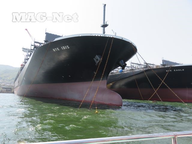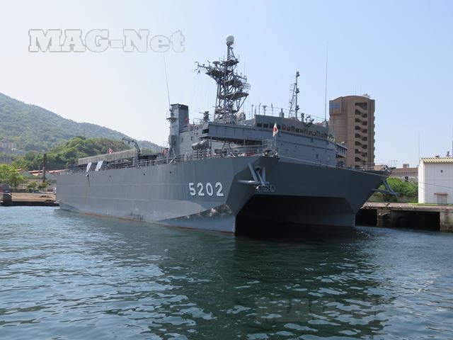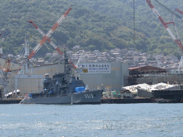 そんな建造中の船舶の間を抜けて、自衛隊の艦船が並ぶ「アレイからすこじま」の沖合に出てきました。
