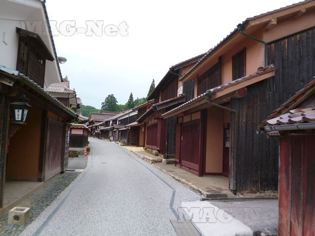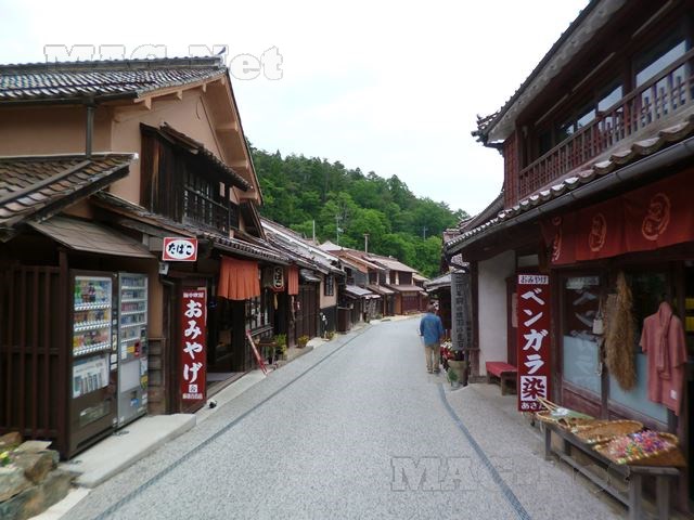 島根県の石見地方で生産される赤っぽい石州瓦とベンガラ漆喰の壁で、町全体が赤く色付く町です。