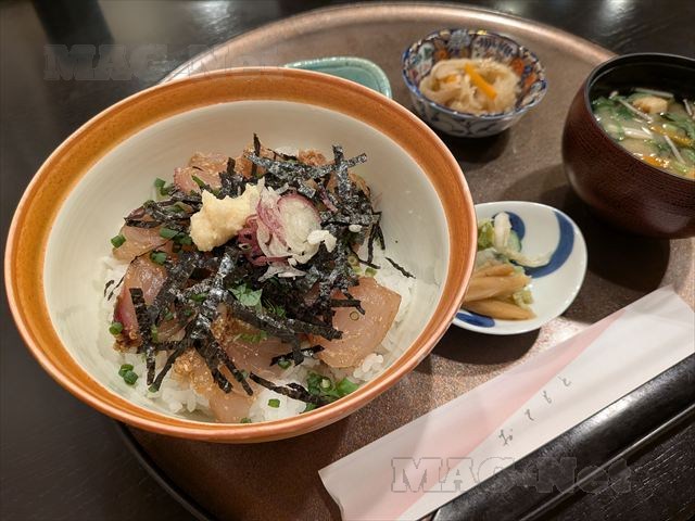 サワラの頭2文字を取った「ワラ丼」は、サワラの醤油漬けを敷き詰めた丼ぶりです。