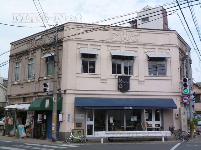 交差点に合わせて、角が澪がれた5角形の形をした建物です。