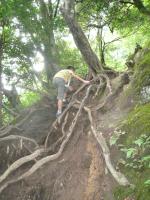 登山道らしき道はなく、急斜面であるが故に木々の根が露出しており、それらを持ちながらもしくは足場にしながら、登り進めていかなければなりません。