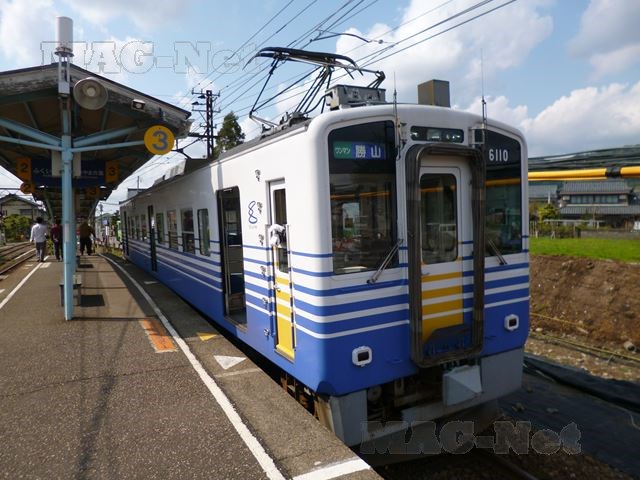 1両編成の単線のえちぜん鉄道は、九頭竜川に沿って走ります。