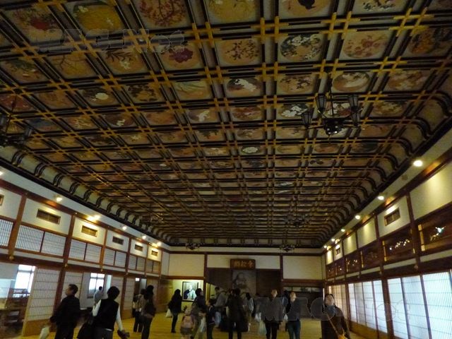 まず最初に訪れた「傘松閣」は160畳敷きの大広で、天井には144人の日本画家が描いた230枚の花鳥彩色画が彩られています。