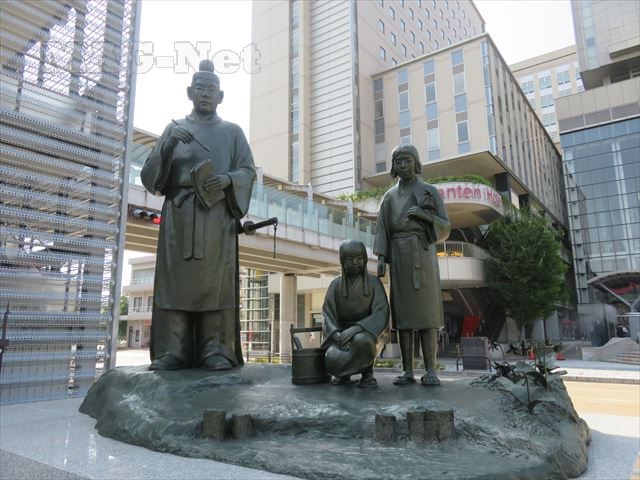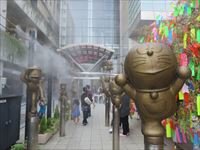 そして「大伴家持像」から通りを挟んだ「ウイングウイング高岡」の市立図書館前に、「ドラえもん」の銅像があります。