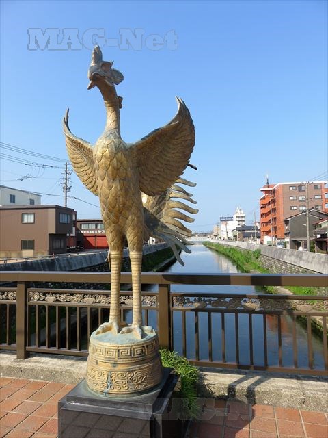 「千保川」に架かる「鳳鳴橋」には、橋の中間部に金色の2体の鳳凰像が向かい合って立っています。