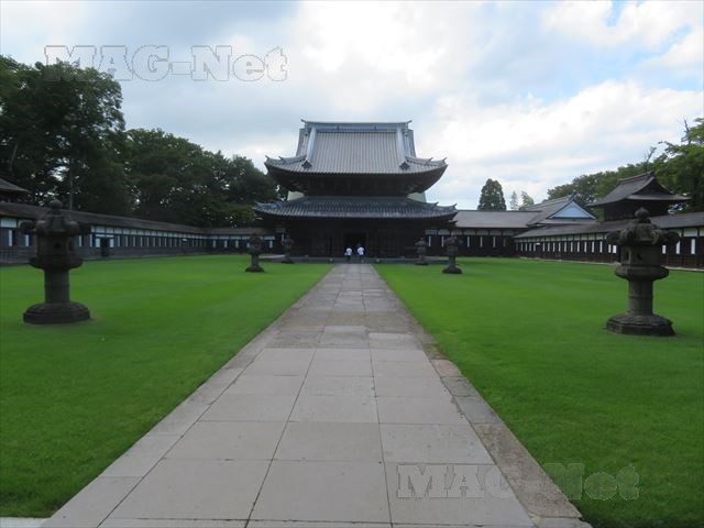その伽藍に囲まれた法堂までの石畳は、左右に緑のじゅうたんが広がります。