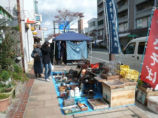 おりしも本日は「骨董市」で、通りは骨董品や古着の着物を並べた露店でびっしり埋め尽くされています。