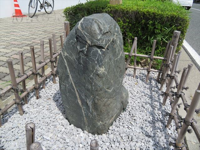東に進むと、歩道の脇に大きな岩が立っています。