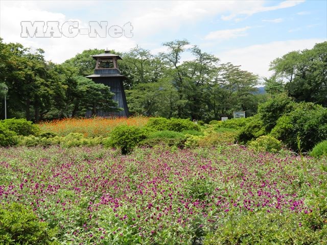 公園内には、再建された鐘楼が顔を覗かせています。