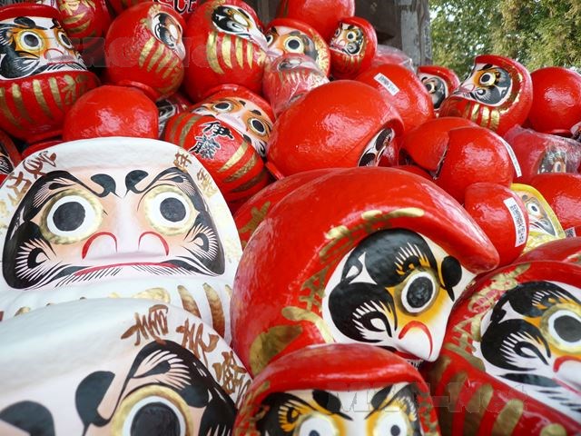 お決まりの赤いだるまの山の中に白い姿のだるまも混ざり、家内安全、商売繁盛、合格祈願のたるま達がうず高く積まれています。