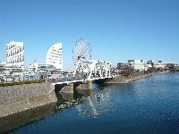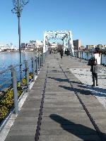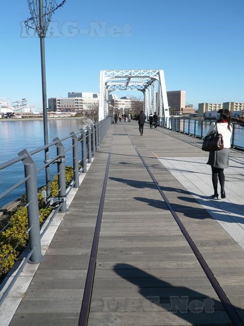 ここは1911年に臨港鉄道の線路跡が復元されたもので、橋の両側は鉄橋の骨組みが、そして歩道の足元には線路が敷かれているのです。