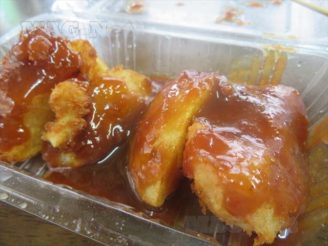 天婦羅にしたじゃがいもに、甘いみそだれがかかっています。