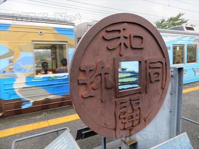 駅のホームには「和銅開珎」のモニュメントが飾られています。