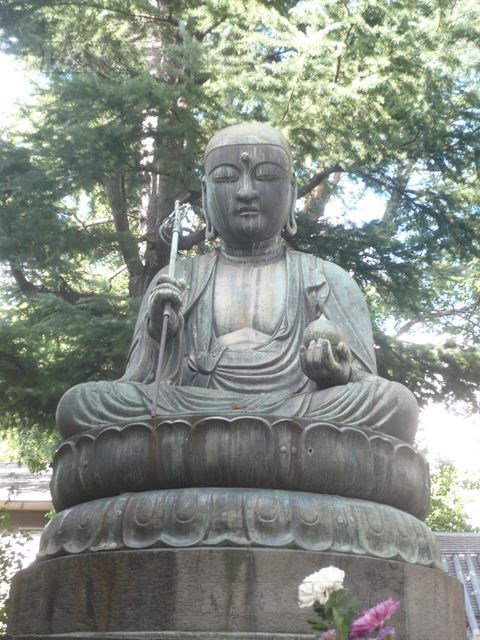 寺の入口には、江戸六地蔵の一つである石の台座の上に安置された地蔵菩薩がどっしりと腰をおろしています。