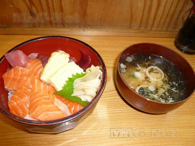 そして出てきたのが、器いっぱいに色鮮やかな赤とオレンジの切り身そして黄色の卵焼きが並べられた丼です。