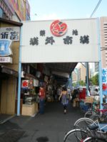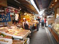 大通りに面した入口には、「築地場外市場」と書かれたアーケードが広がり、乾物屋、丼屋などが軒を並べています。