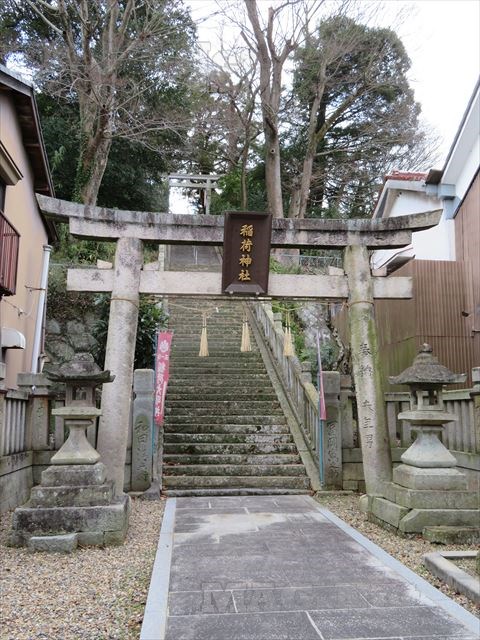この先は、商店街を抜けて右手に「上の丸稲荷神社」への石段を眺めながら、神戸電鉄の線路と交差します。