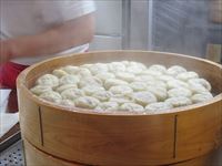 豚まんの皮にあんを詰めそれを蒸しているのがガラス越しに見えます。