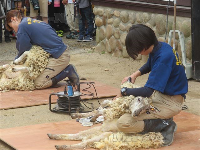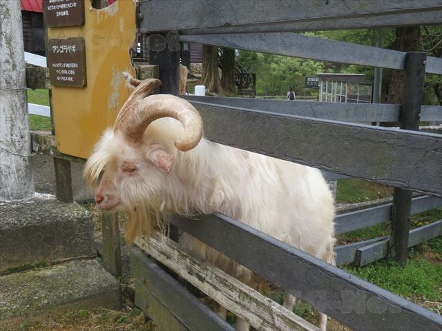 毛刈り会場の横では、立派な角を持ったヤギが飼育されています。