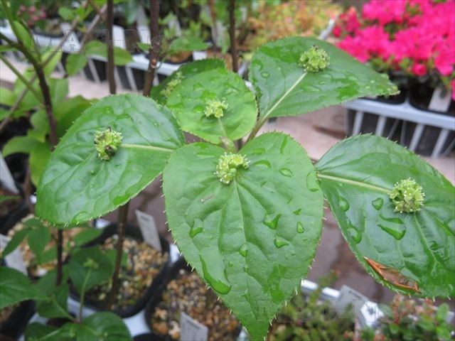 ハナイカダで、葉の中央で花が咲く珍しいものです。
