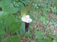 緑の中で目立つ白い特徴のある形の花は、普段見ることができない珍しいものです。