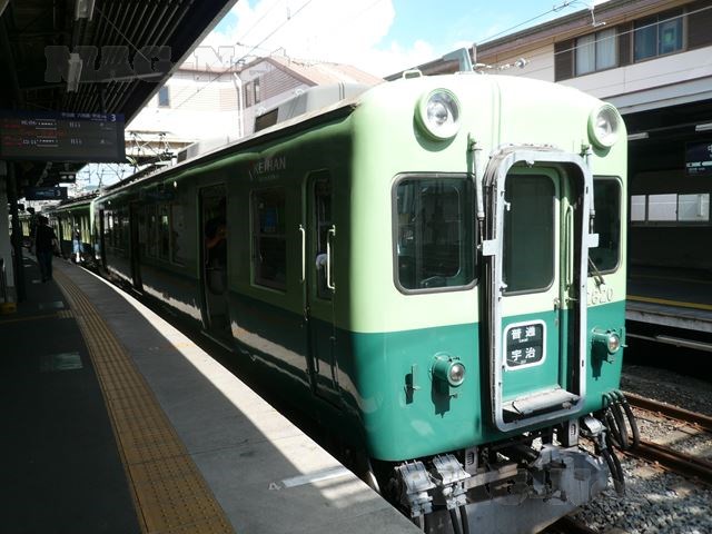 京阪本線の祇園四条駅から、各駅停車に乗り込みます。