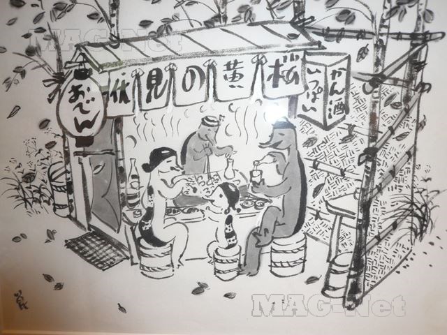河童の墨絵が飾られたホールでは、歴代のコマーシャル映像を見ることができます。