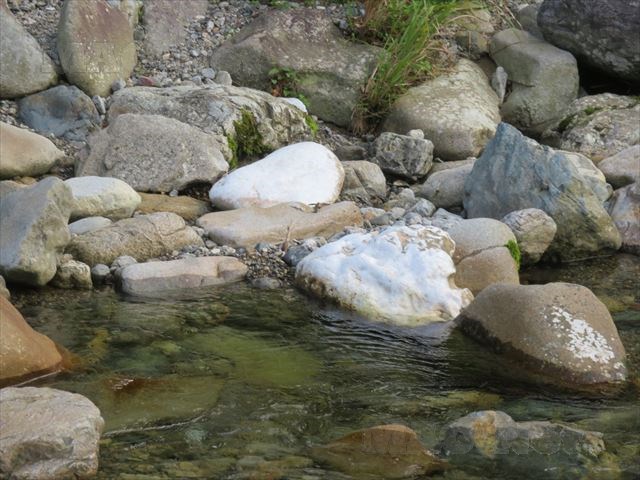 山上川には、白い石が転がっています。
