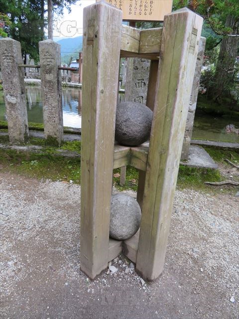 そして境内には木枠の中に丸い石が置かれています。