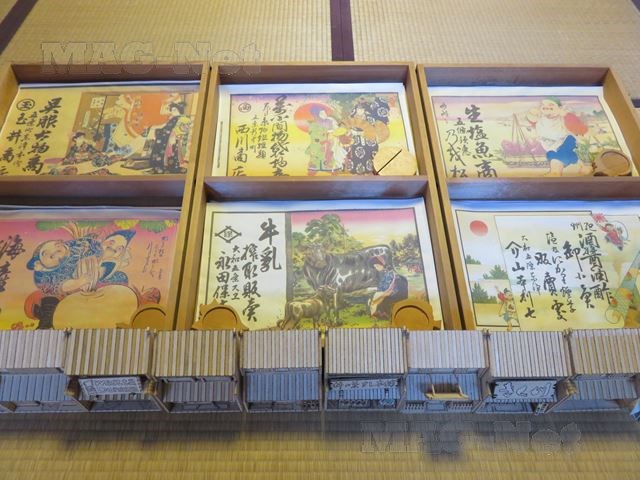現在のチラシに当たる店を紹介した手刷りの用紙が、展示されています。
