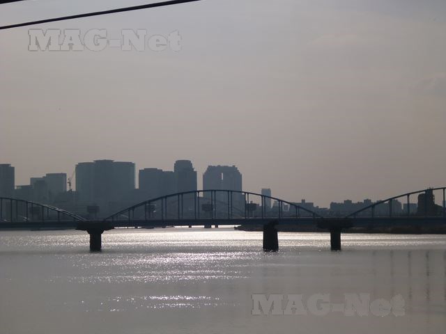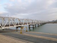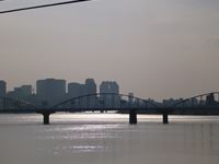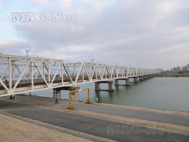 先には、淀川を横切る白い色の鉄橋が見えます。