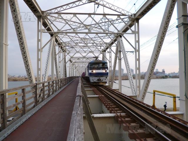 南に向かって、右が貨物線、そして左半分が人間専用の赤い舗装の道で、列車と人が仲良くひとつの鉄橋を使うのは、日本でもここだけです。