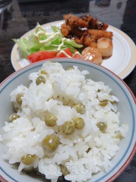 色はグリンピースの方が緑が鮮やかですが、ウスイエンドウの皮はとにかく軟らかく、ごはんとなじんでいます。