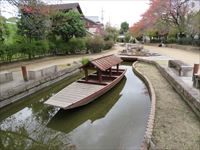 「水面迴廊」の端には三十石船が置かれ、水辺の散歩に最適の場所です。