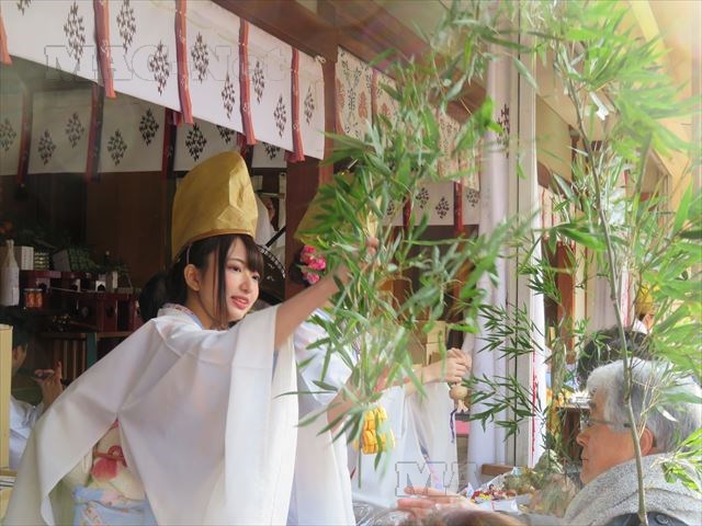 社務所では千早と金烏帽子を着装した福娘が、縁起物である福笹に小判や鯛、俵などの飾りを付けています。