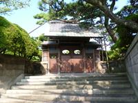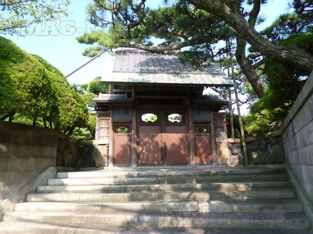 長く続く塀の南側には。階段の先に大きな木の門があります。