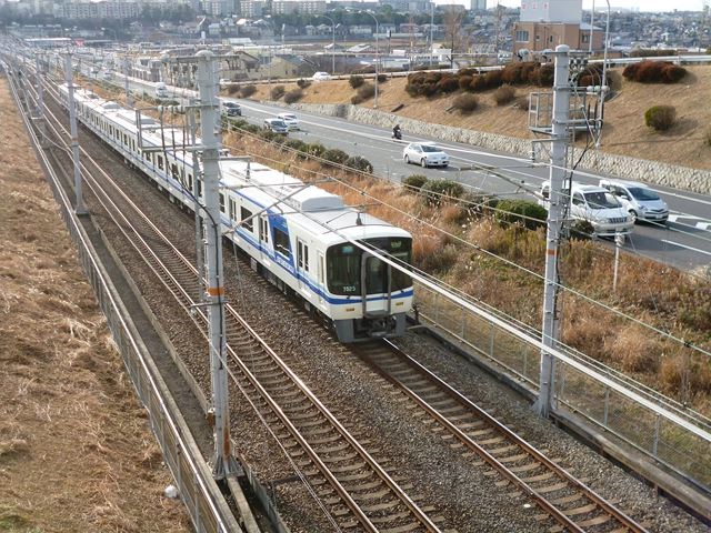 日本一料金の高い乗り物として悪名高い「泉北高速鉄道」からは、線路の両端に通る高速道路のような高架道路の先に、あちらこちらに建つ高層マンションを見ることができます。