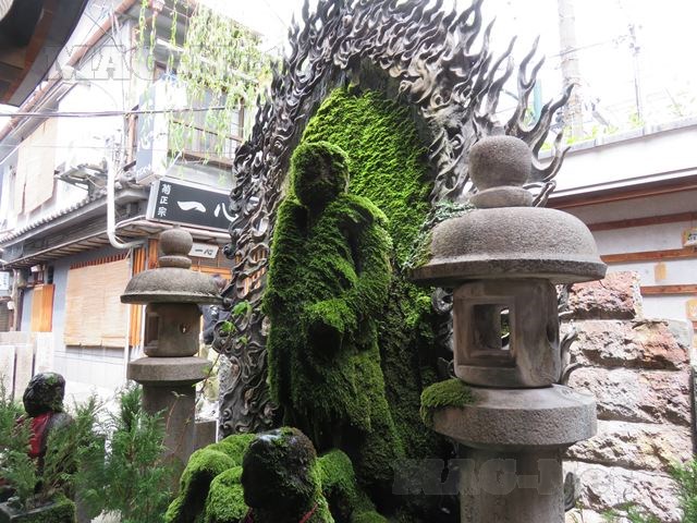 参拝者が願いを唱えて水をかける不動明王は苔生して、「水かけ不動」の名で親しまれています。