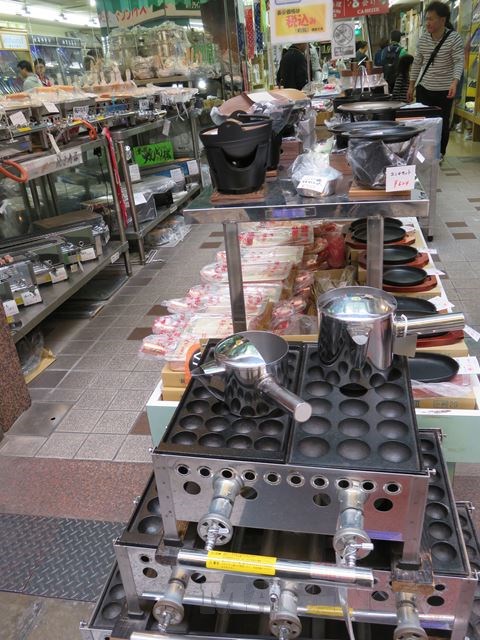 さすが大阪の町らしく、どの店にも決まって店頭に飾られているのはたこやき器なのです。
