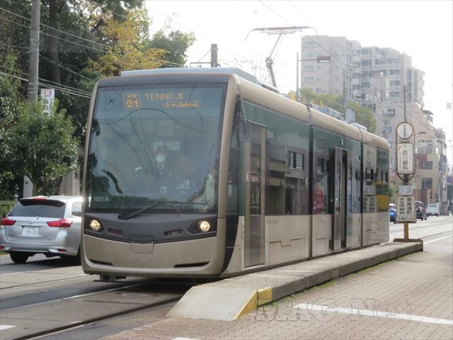 「住吉大社」の前には、「阪堺電車」という路面電車が走っています。