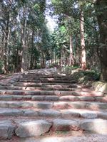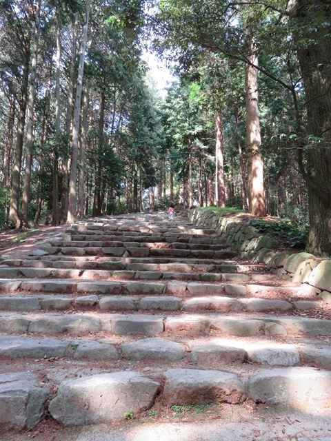 進むにつれてさらに石段は傾きを増し、周りの木々が石段まで迫ってきます。