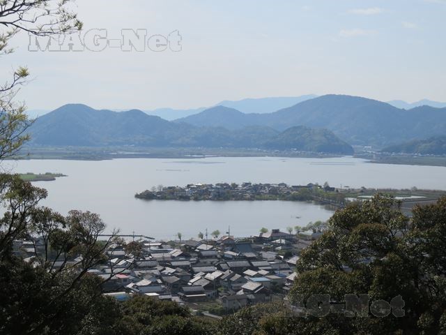 その先の山が目賀田山(現在の安土山)で、山腹には「安土城址」と書かれた大きな看板が掲げられています。