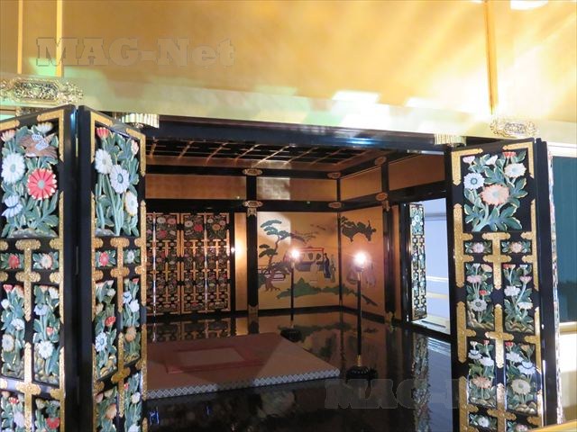 6階は金箔が施された正方形の部屋で柱は黒漆塗り、きらびやかでいながら趣のある造りになっています。