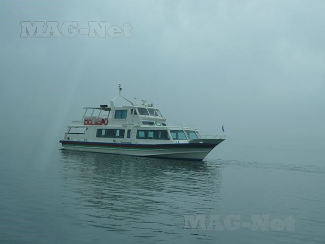 高速艇で片道40分かかる竹生島までの行程ですが、今日は雲がかかりどんよりした琵琶湖は対岸はおそか、水面と空の境すら見分けがつきません。