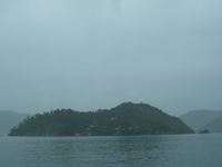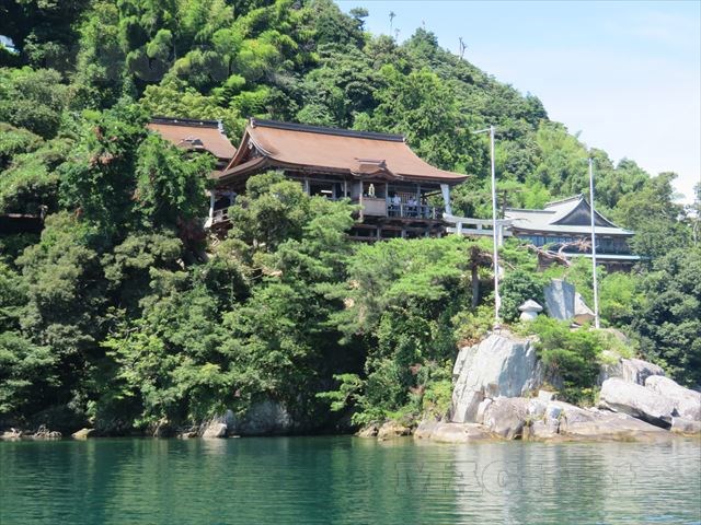 周囲2kmの竹生島には針葉樹林で覆われ、港以外は寺、神社の建物とそこに続く階段が見えるのみです。