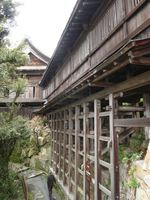 廊下を渡っているときは気付きませんが、外から見ると急な傾斜面に柱を渡して造られた建築物です。