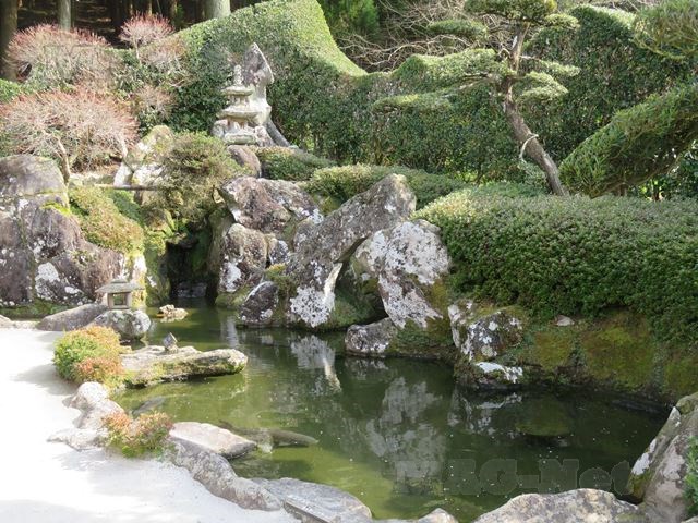 池の周りを囲む石に付いた苔が、きれいな庭です。