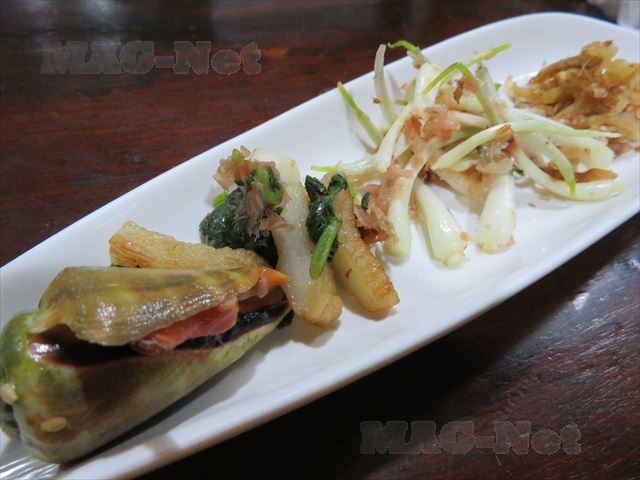 つきだしで出てきたのは、トビンニャ貝と島ラッキョウなどが盛られた小鉢です。