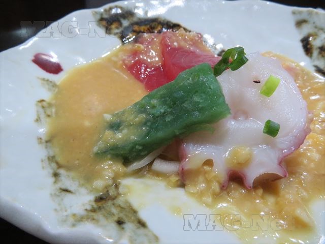 刺身は醤油ではなく、酢味噌をつけていただきます。
