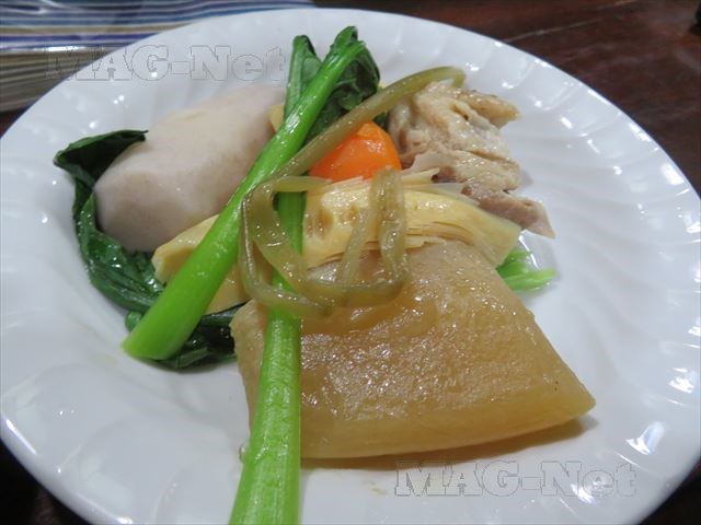 その他に豚肉とフダンソウ、ツワブキ、タケノコを蒸した「ウワンフネ」、冬瓜が入ったアオサ汁、そして鳥のもものひらき、鶏飯など、島料理も出てきます。